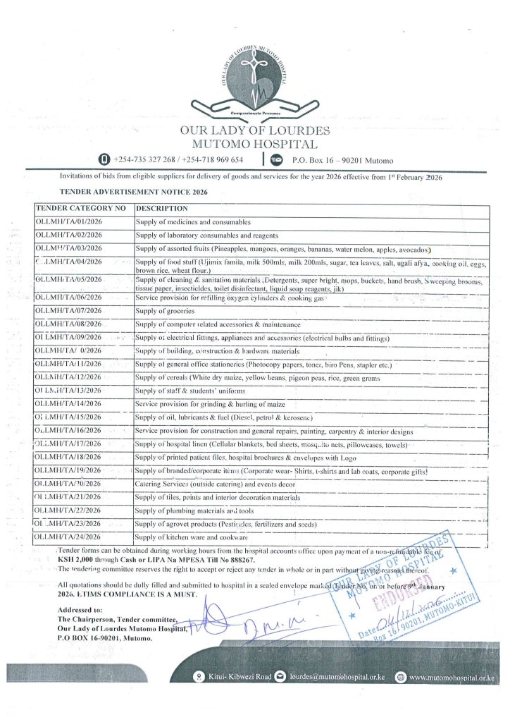 Our Lady of Lourdes Mutomo Hospital invites bids from eligible suppliers for the delivery of goods and services for the year 2026. Please see the tender details below: